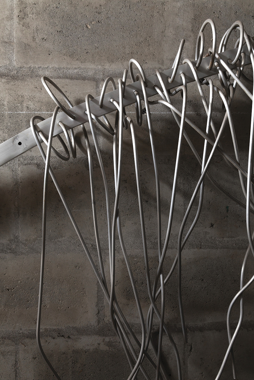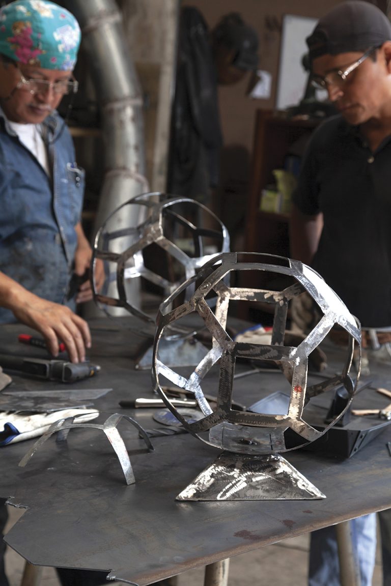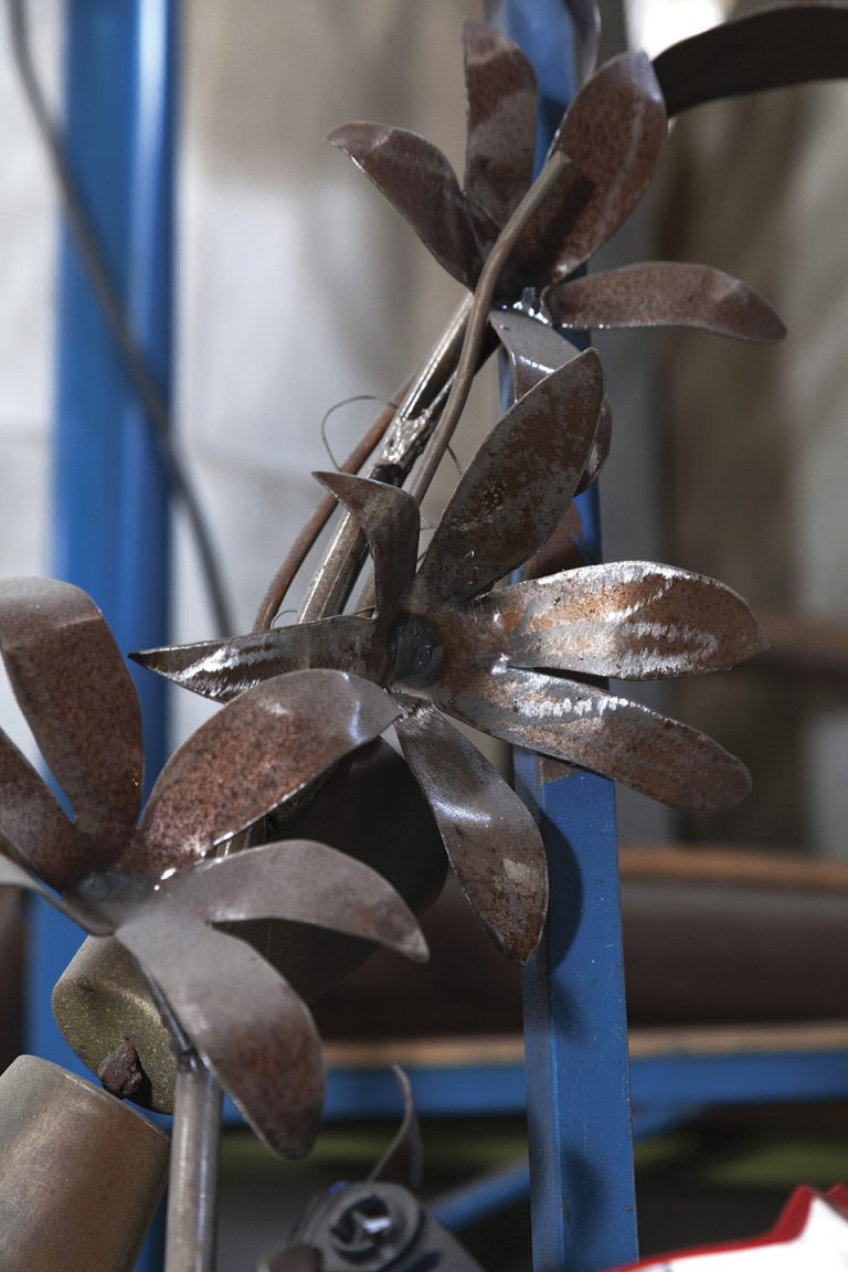 Mayormente en hierro, pero también me gusta mucho el aluminio porque es longevo, brilla mucho más que el acero y no pesa ni la mitad. También madera y otros elementos de uso común que los combino para complementar mis creaciones, de tal manera que una será la mirada que tendrá la pieza a la distancia, y otra la que tendrá al admirarla de cerca. Mi obra tiene algo de sarcasmo, de ilusión, de historia y de descubrimiento; es la fusión de materiales fuertes con otros más suaves para invocar sensibilidades en la gente.