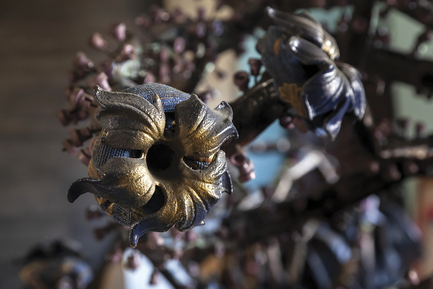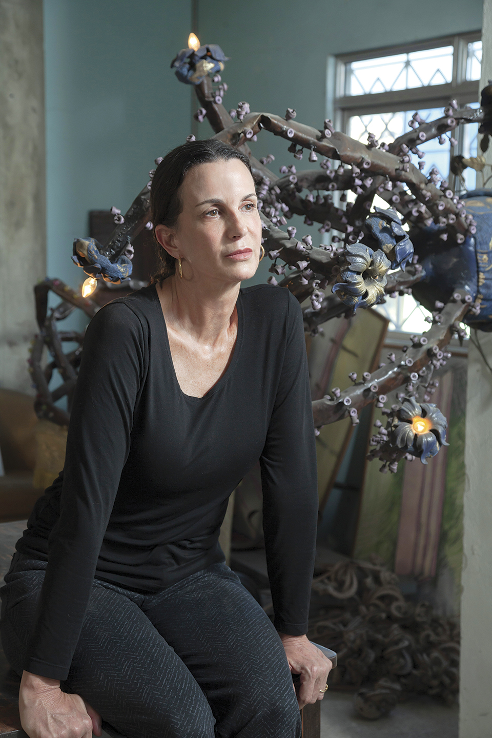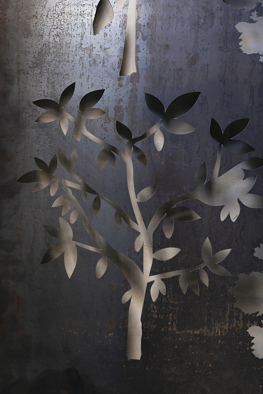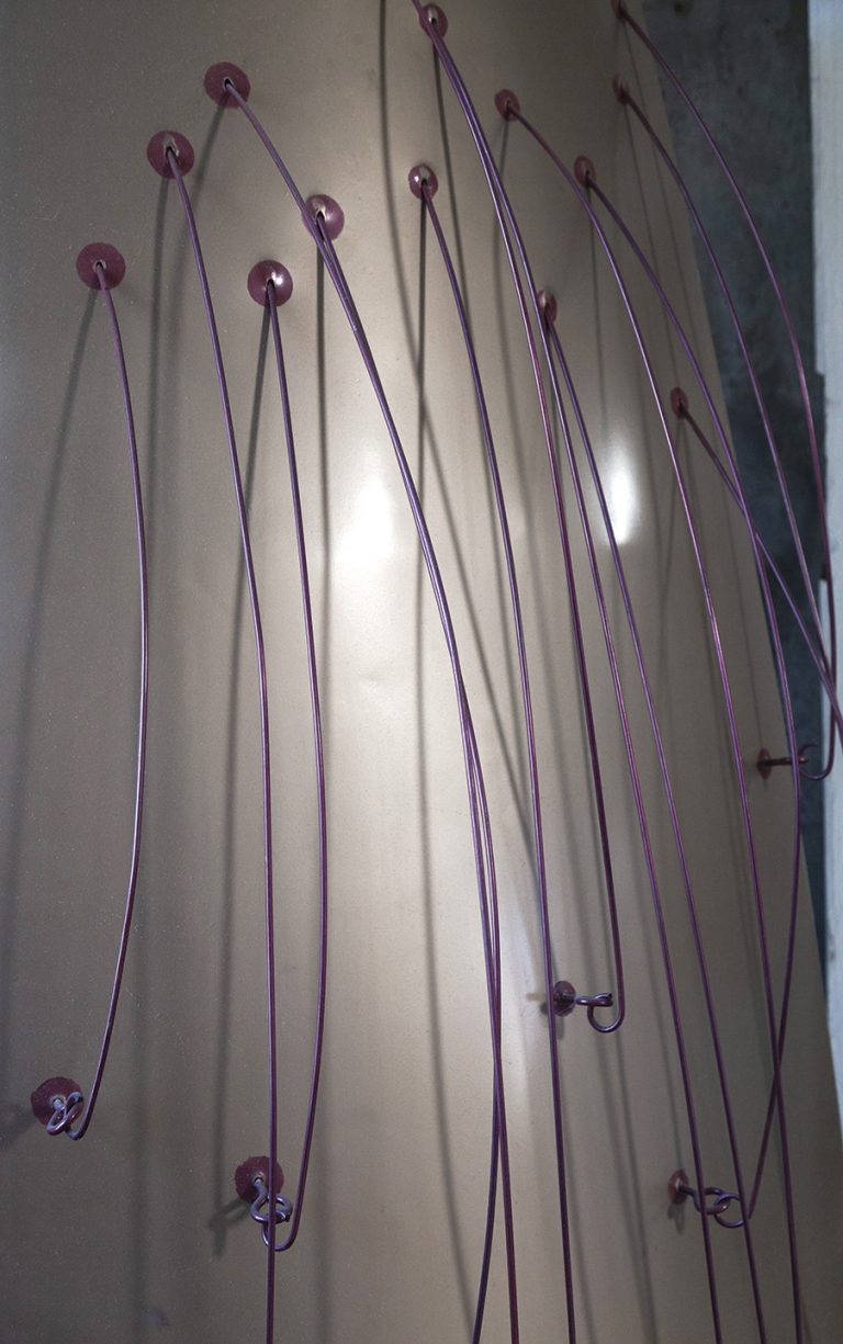 Hago mucho de repetición lineal. En mi interpretación de tallos de árboles y plantas que trabajé sobre una base en madera, los pinté de verde y puse luz interna. Amo las sombras que proyectan, es una cosa espectacular. Hay un árbol mío, gigante, en Picaya Lodge, Galápagos. Fue hecho a mano en aluminio súper labrado, muy trabajado. También hice 14 esculturas de árboles para la Bienal de Cuenca, que se colocaron enfrente del Museo Pumapungo. Con ellos representé lo que vi en mis caminatas por el bosque de árboles de papel en El Cajas. Los dejé en metal oxidado para llamar la atención ante la deforestación de este árbol autóctono de nuestra sierra que está desapareciendo por la tala.